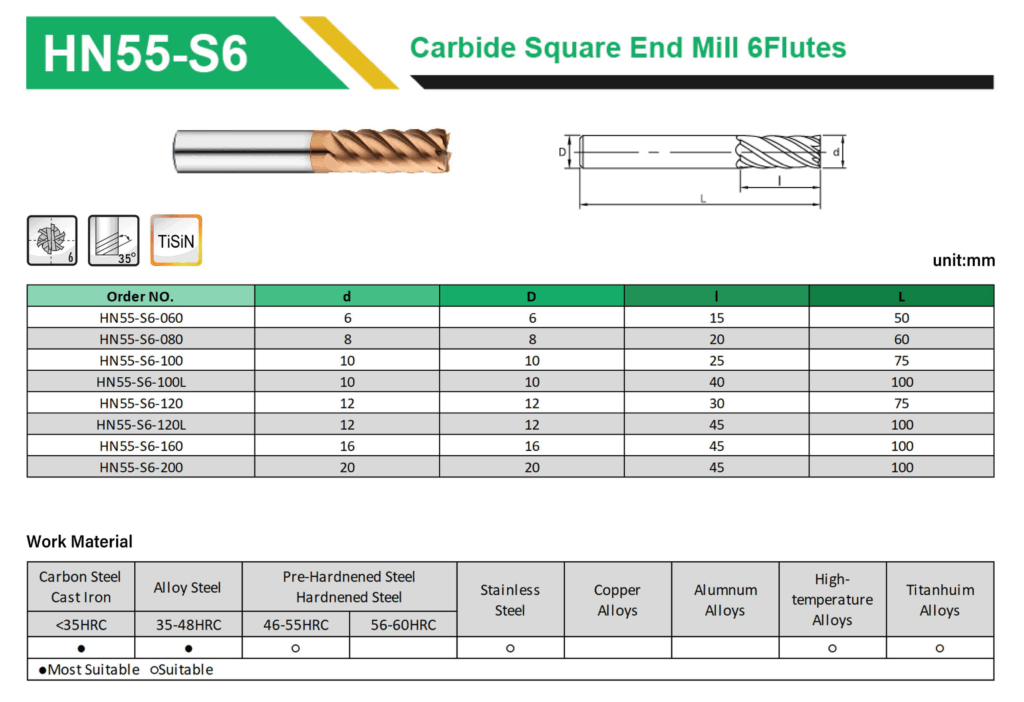 Even with difficult-to-work-with materials, end mills with 4 and 6 flutes are able to perform exceptionally well. This is because of their design. The AlTi coating that is standard on HUANA end mills gives outstanding hardness and a prolonged tool life in high-temperature alloys and ferrous materials up to 45Rc. This coating can withstand temperatures as high as 450 degrees Celsius. This is accomplished by placing a protective barrier between the instrument that is being used and the substance that is being worked with. Because of the chip thinning capabilities of the tools in question as well as the tool shape that is applied with continuous radii, the tools end up being more rigid as a combined effect of these two factors. As a direct consequence of this, the instruments may be employed at higher feed rates. In addition to this, all of the cutting forces are directed upwards into the spindle, which helps to prevent vibration as well as deflection.